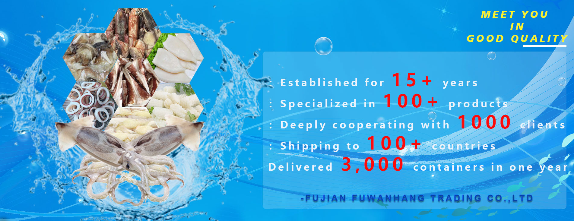 FUJIAN FUWANHANG TRADING CO,.LTD (HONGKONG HUIZE INDUSTRY SHARES LIMITEDis owned by Fuwanhang)is an international trading company which is professional in various frozen seafood importing and exporting, raw material purchasing and wholesaling. Our company located in southeast of China-- Fuzhou, an opening harbor city. Our main products are all kinds of squid, octopus, pelagic fish(including marlin, oilfish, mahi-mahi, tuna fish, bonito and so on), pacific mackerel and many raw material seafood and processed seafood. These products are widely exported to over 30 countries and regions, such as Southeast Asia, Europe, America and Africa market and get good reputation from our customers around the world.Company has strong economic strength , strong technical force, advanced technology and equipment, perfect production and inspection management system, powerful network resources, young team full of combat effectiveness.We always hold the ideal of :'' quality first, clients first and honest first" to supply superior quality and reasonable price products.We cordially welcome overseas friends to visit our company and to establish long- term business relationships.